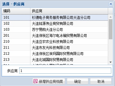 2. 键盘操作:直接在输入框中输入供应商的编码的第一个字符、名称拼音字头的第一个字符。